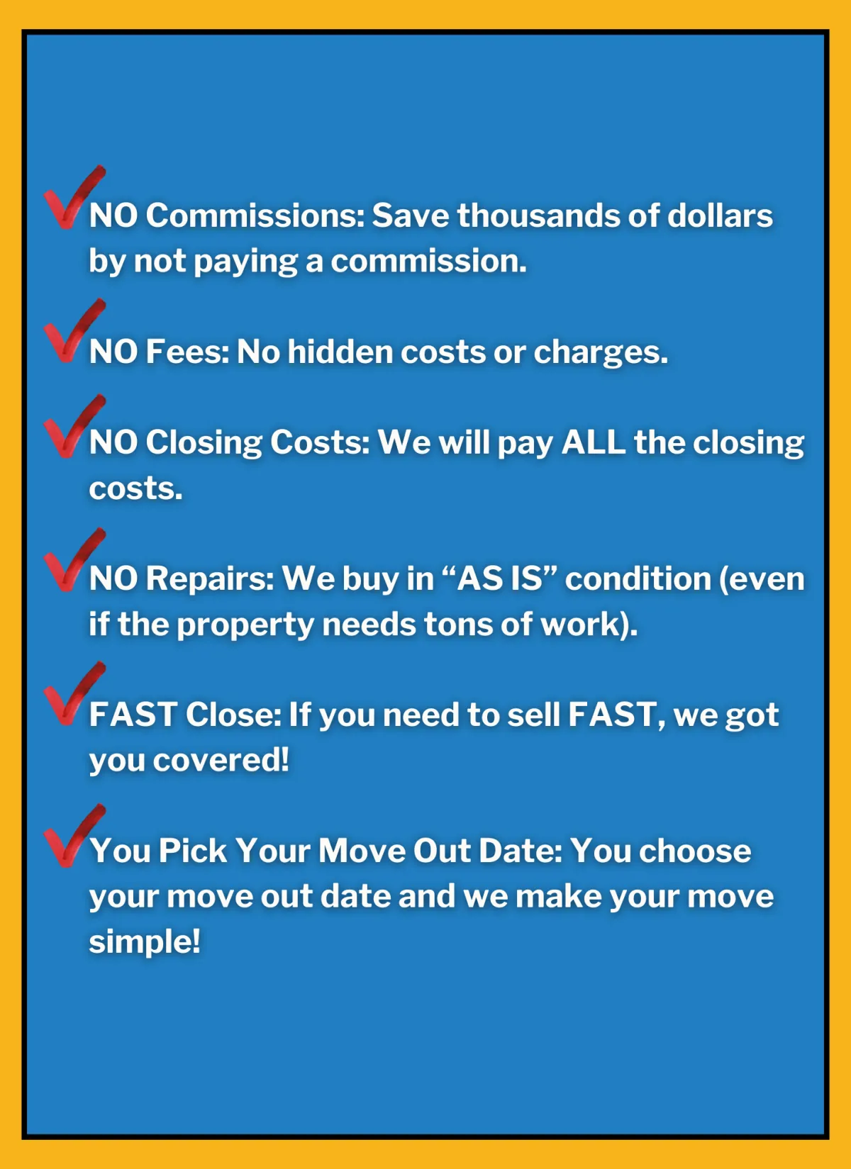 There are no costs or fees involved when you choose to sell your home to us. This sets us apart from the traditional selling process where fees and commissions can add up. We believe in transparency and fairness, offering you a straightforward cash offer without any obligations or hidden charges. Plus, we often cover the closing costs, making the process even smoother for you. If you’re considering selling your home for cash, let us make it easy for you with a no-cost, no-obligation offer. It’s a hassle-free way to unlock the value of your home quickly and conveniently.